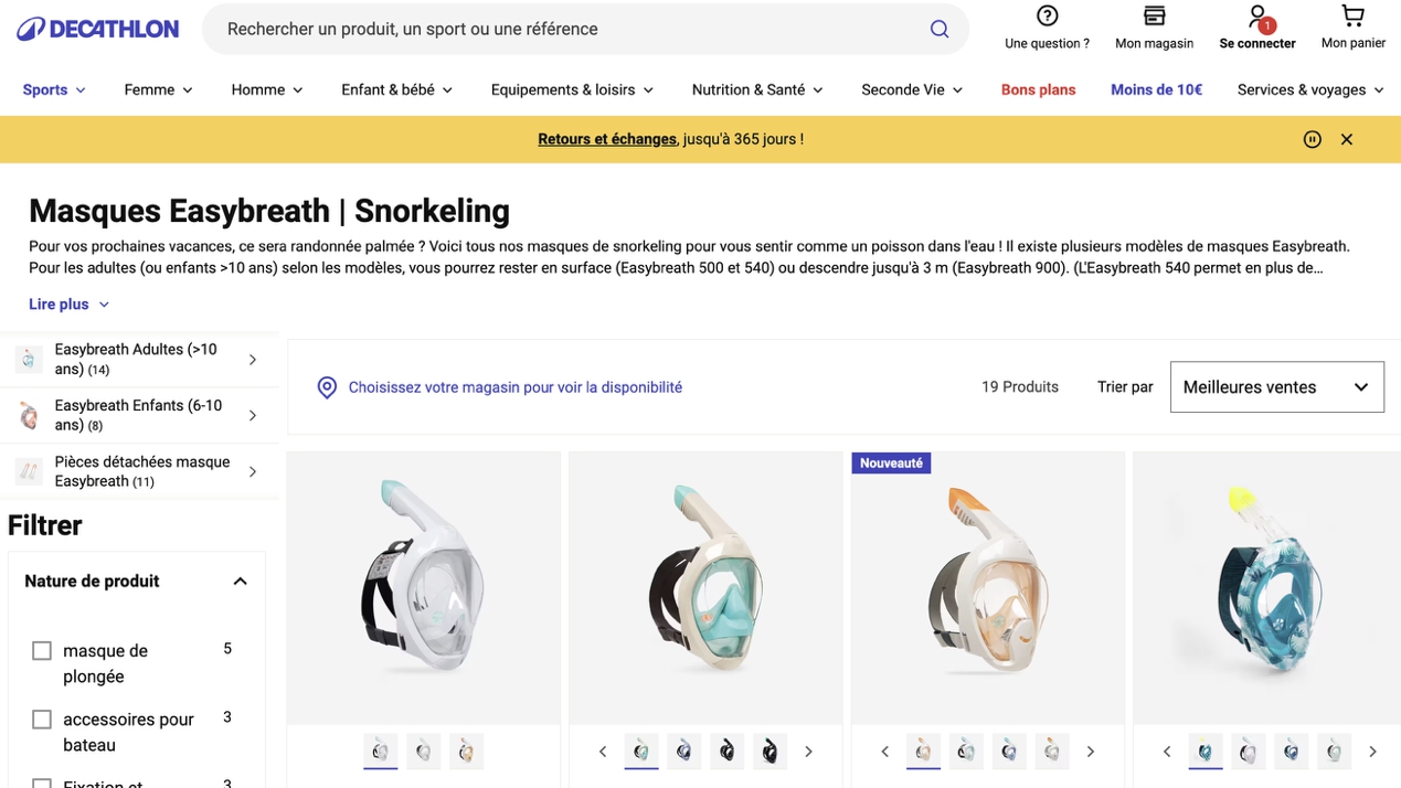 Easybreath浮潜面罩的核心创新在于,它让初学者也能像在陆地一样自然呼吸,轻松地拥抱水下世界。这是一个为“体验”而生的产品。迪卡侬没有将它简单地放在官网庞大的产品目录中,而是为它创建了一个专属的数字空间。后缀在这里起到了画龙点睛的作用。
